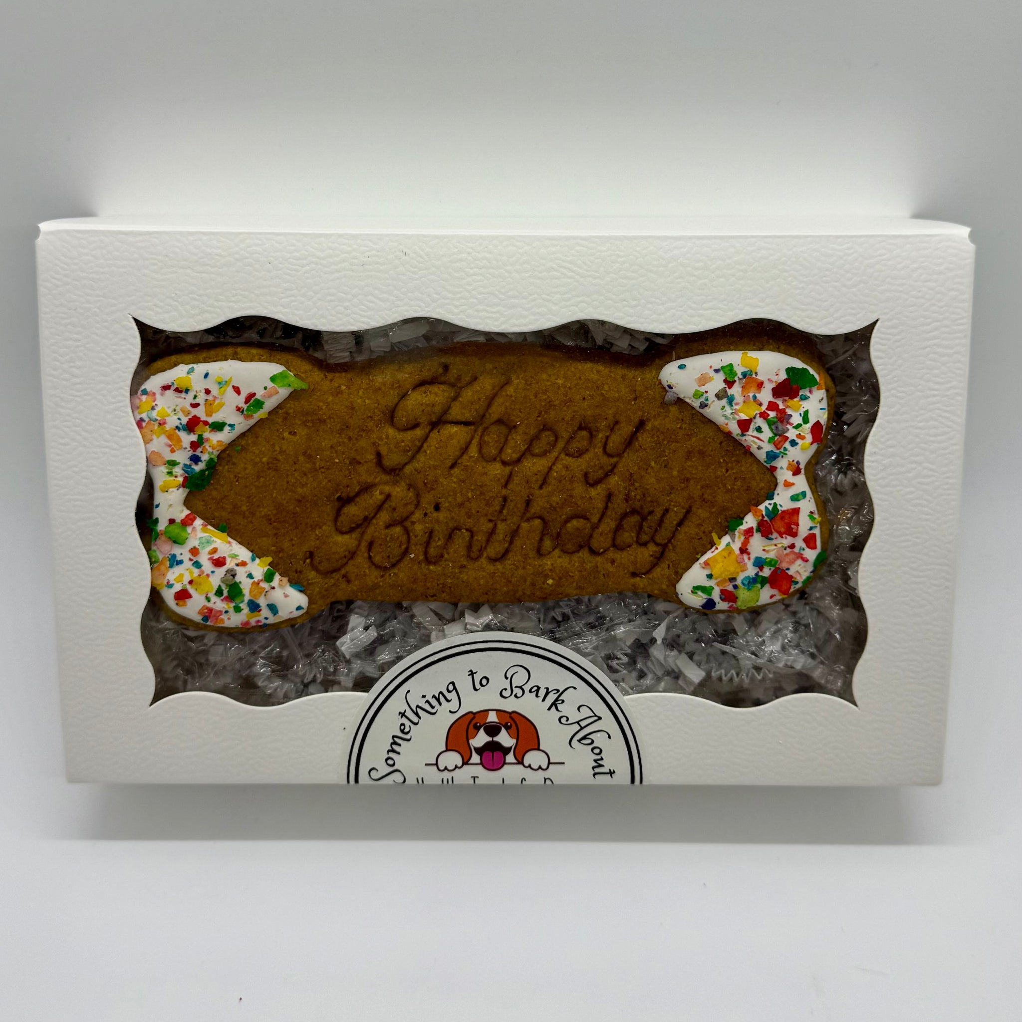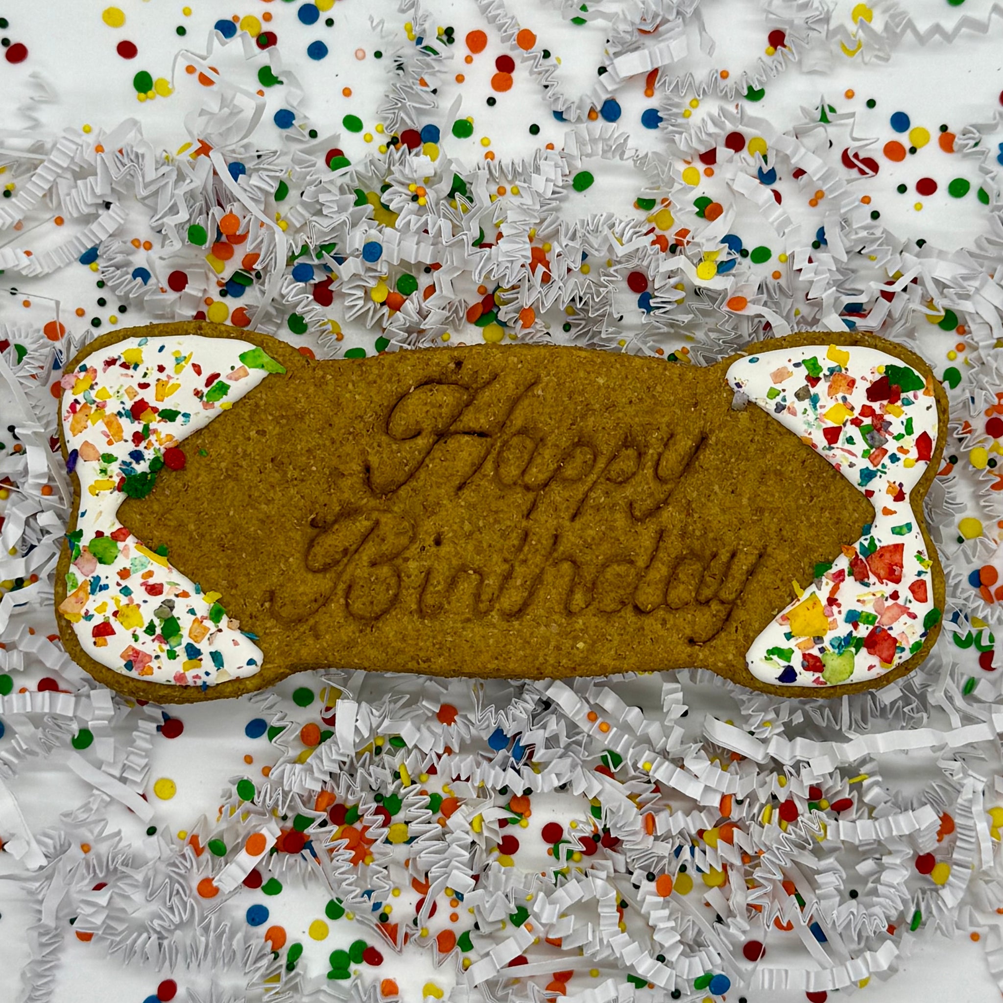Don't have time to pickup our freshly baked pupcakes or birthday cakes for your dog's special day? Then order a jumbo Happy Birthday Bone! The jumbo bone is approximately 5.5" in length and 2.5" wide. It has a shelf life of 9+ months if your dog is watching his or figure and doesn't want to gobble up the whole bone at once! It is made from our signature pumpkin peanut butter treats with dog friendly icing and colored unsweetened coconut flakes for sprinkles!
